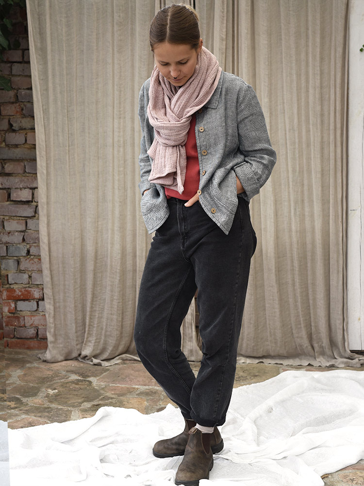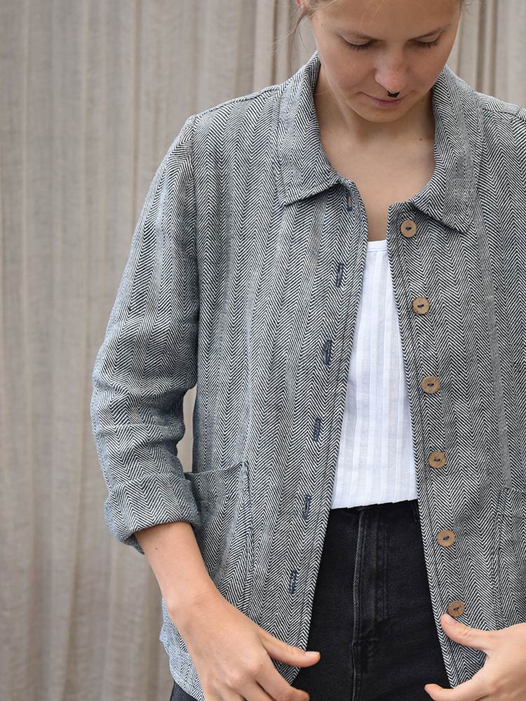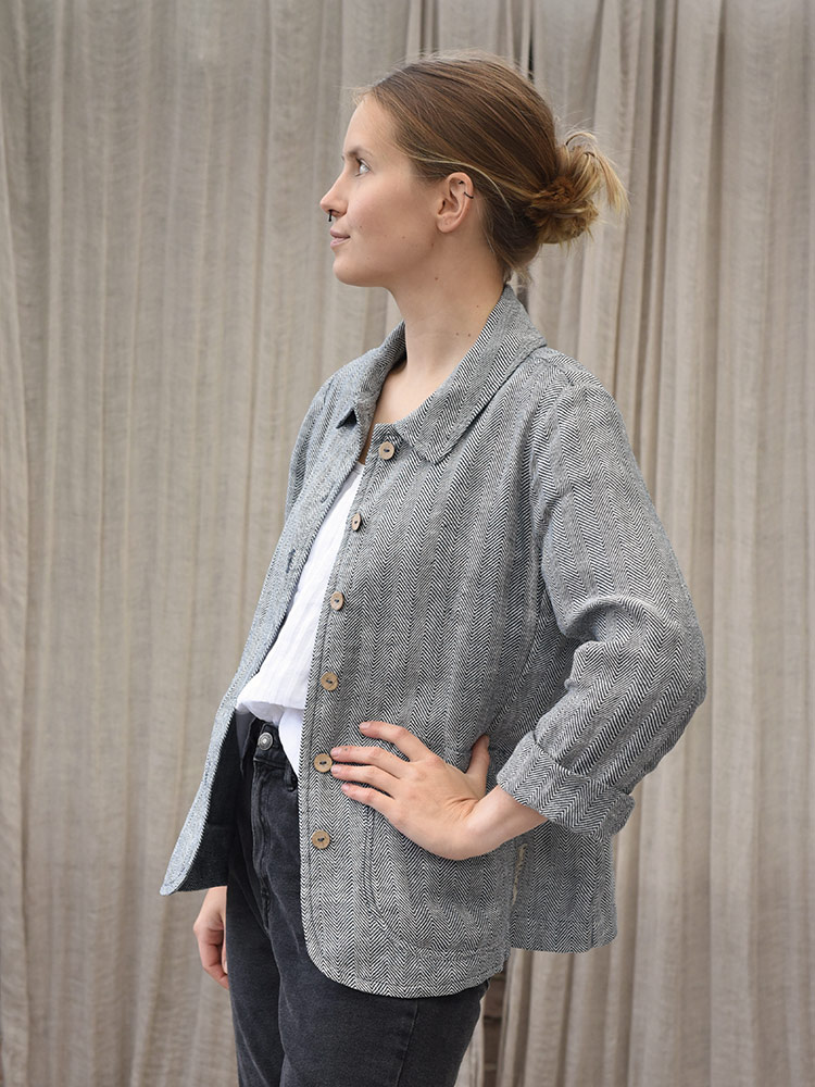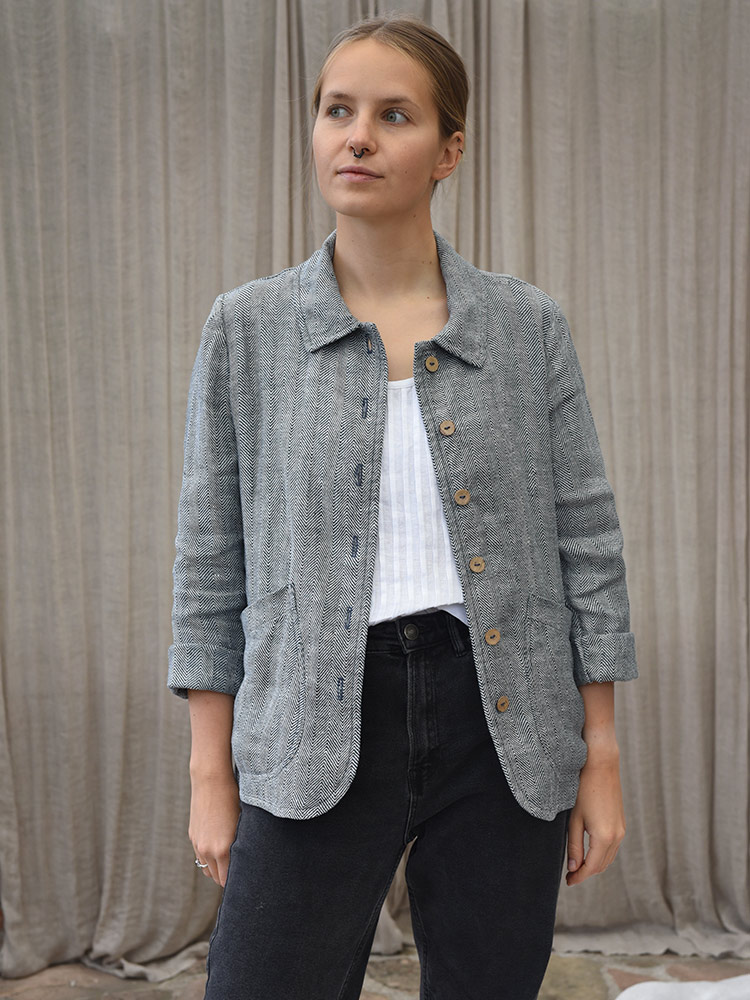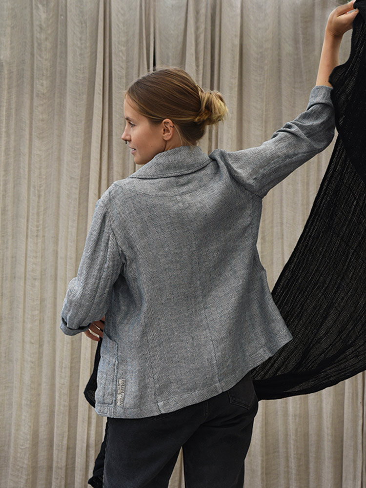 Marynarka z lnu w klasyczną jodełkę, zaprojektowana tak, by łączyć rzemieślniczą precyzję z nowoczesną lekkością.