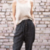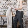 Lniane spodnie na jakie długo czekaliśmy, dla których inspiracją było nasze beztroskie dzieciństwo. Bieganie na bosaka po polach, leżakowanie na kwiecistej łące, łapanie motyli... Spodnie na luzie, z szeregiem kokosowych guzików na długim zapięciu. Lniane spodnie o lekko obniżonym kroku i wysokim stanie. Nogawka o długości do kostki. Spodnie najlepiej się noszą jak są kilka razy 'niedbale' podwinięte. Wygodne kieszenie po bokach. Spodnie z przodu są dopasowane z zakładkami. Z tyłu w pasie mają wygodną gumkę, która dopasuje się do różnych rozmiarów kobiecej talii. Do tego szlufki i wąziutki lniany paseczek, który jeszcze doreguluje pas dla wygody. Całość odszyta krytym szwem francuskim z idealną precyzją oraz dopracowanym detalem przy kieszeniach i zapięciu na guziki. 100% len, prany i zmiękczany. Pomiar ubrania ułożonego na płaskiej powierzchni z pasem ściągniętym gumą (±2cm).