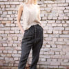 Na zdjęciach spodnie są pokazane w kolorze jodłowy zagajnik (len w jodełkę) na modelce o wzroście 180cm, noszącej rozmiar M. Modelka do spodni ubrała lnianą bluzkę Vilo w kolorze naturalnym.